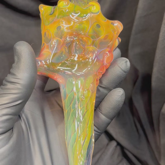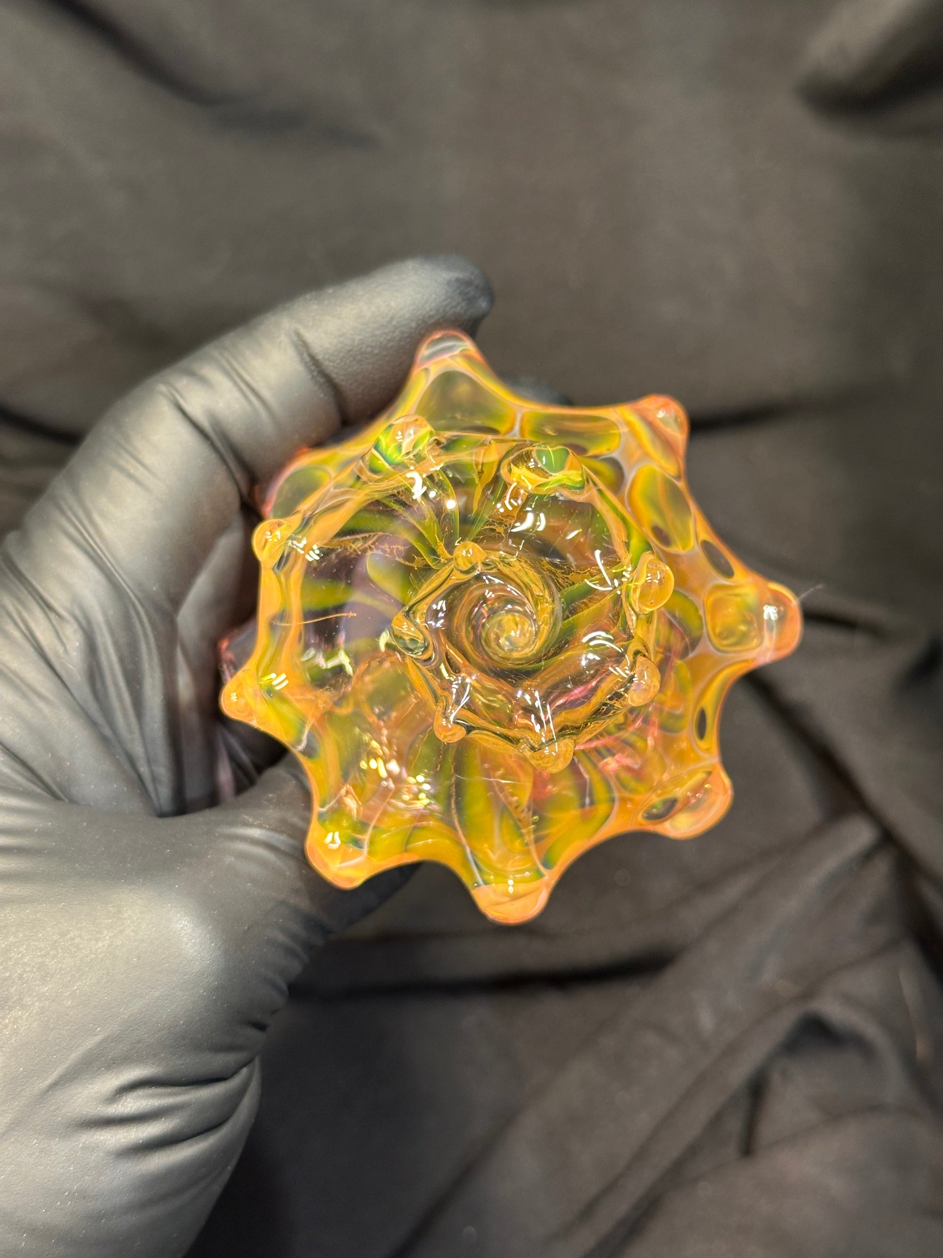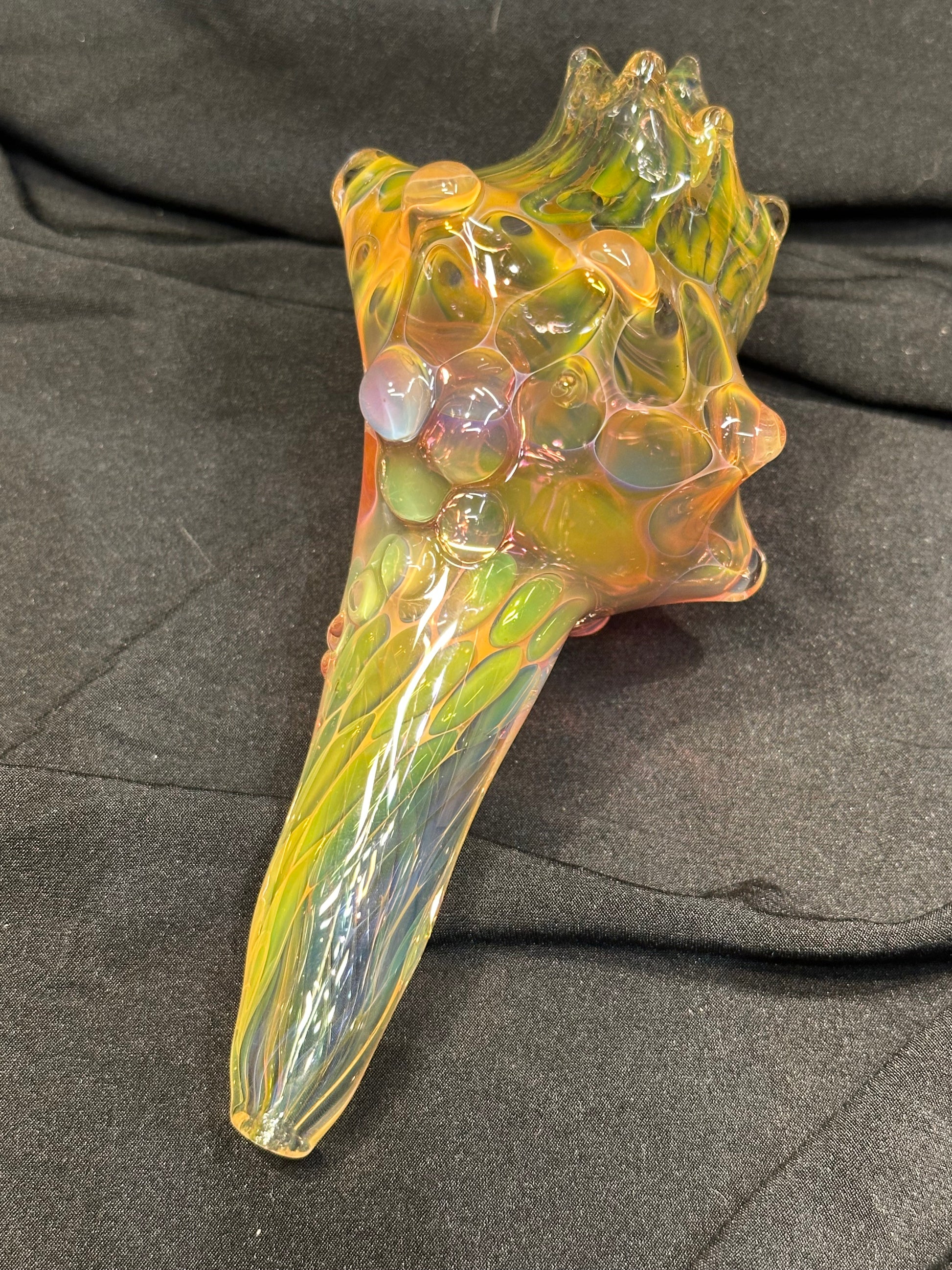 This beautiful spike shell is colored with silver and gold fume trapped on the inside by clear lines and dots creating a playful texture exploding outward that will contrast more and more as you fill it in with love.
